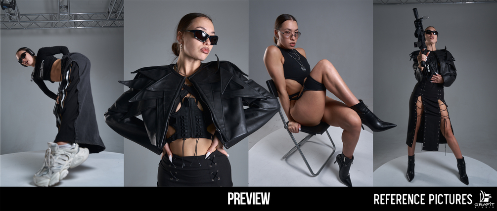 1200+ Urban Techno Fashion – Dynamic Poses Reference Pack is a high-quality fashion reference pack featuring a young female model in bold urban techno fashion looks. The model is expressive and physically controlled. She poses naturally, with clear posture and strong body lines, making this pack perfect for character design, concept art, and fashion illustration.