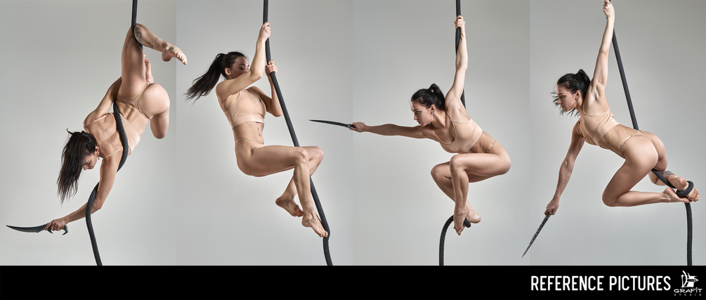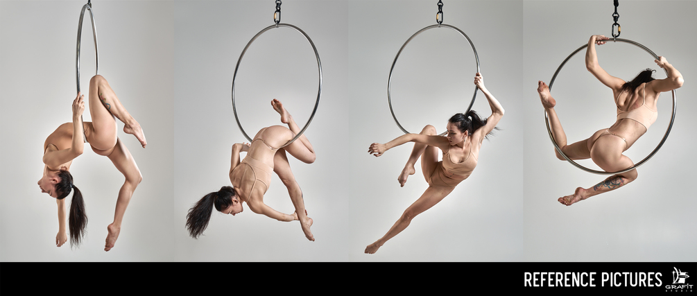 This reference pack includes 700+ high-quality images of a female model performing acrobatic poses on rings and rope. Poses feature a wide range of grips with hands and legs, inverted positions, and complex aerial movements.