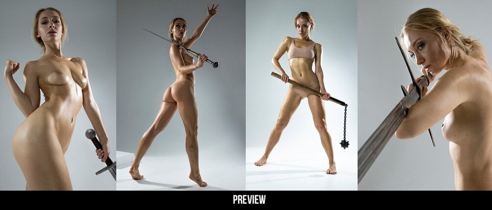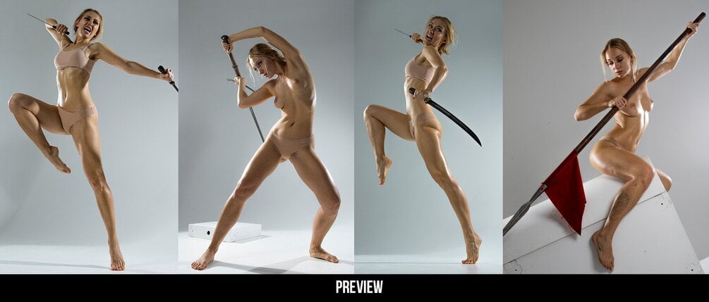This pack includes over 200 high-res reference pictures with female character poses. Please keep in mind this pack aims to portray stylized, exaggareted poses of a character, not an actual person using different weapons. It's based on common poses of existing 2D artworks and would be a great tool for beginner and advanced artists to speed up their drawing process. The pack features a two-handed sword, a generic sword, daggers, a spear, a crossbow and a mace. Check out the previews!