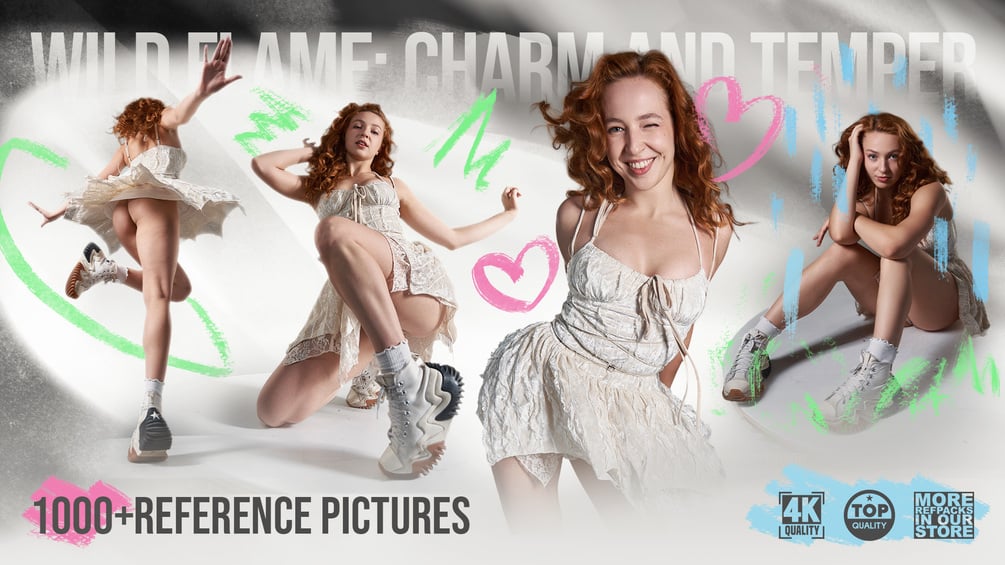 1000+ high-res photos of a red-haired model in a cream ruffled mini dress. The pack combines two strong elements: playful charm and hidden fire. This contrast makes the set stand out and gives the poses a unique intensity.