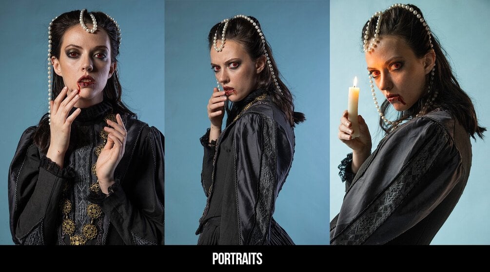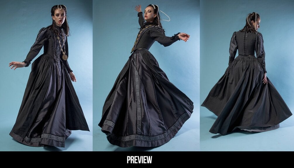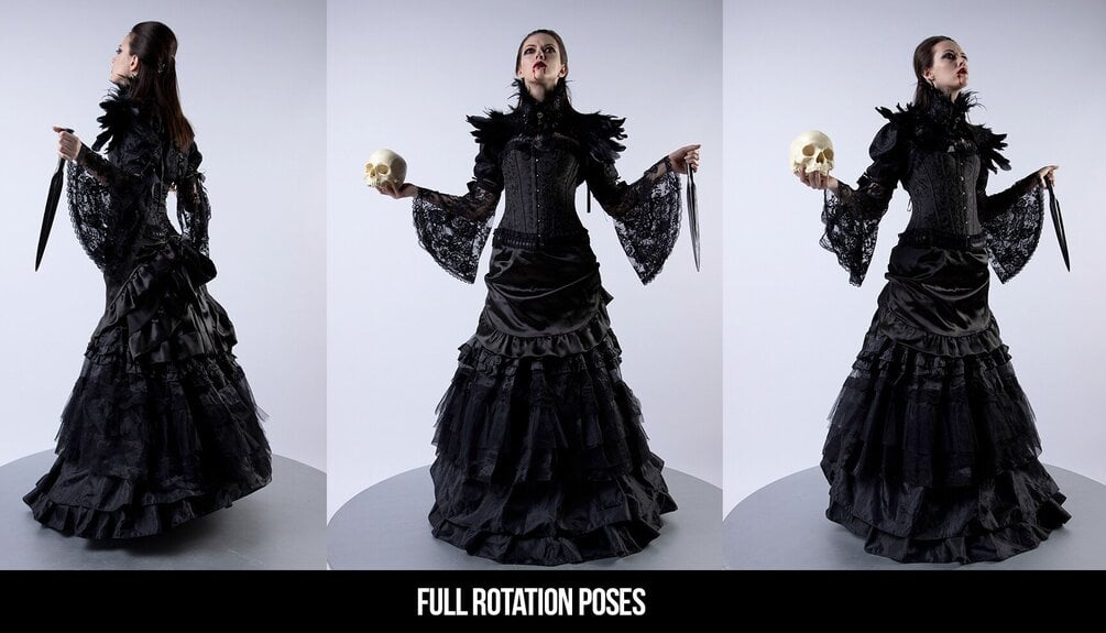 This set features over 500 high-res reference pictures with gothic vampire type of character. The pack inludes portrait close-ups, turnaround poses shot using a rotating platform, as well as some more dynamic movements with folds in motion. It will be a great tool for artists working on illustrations, book cover art, concept art and more! Check out the previews!