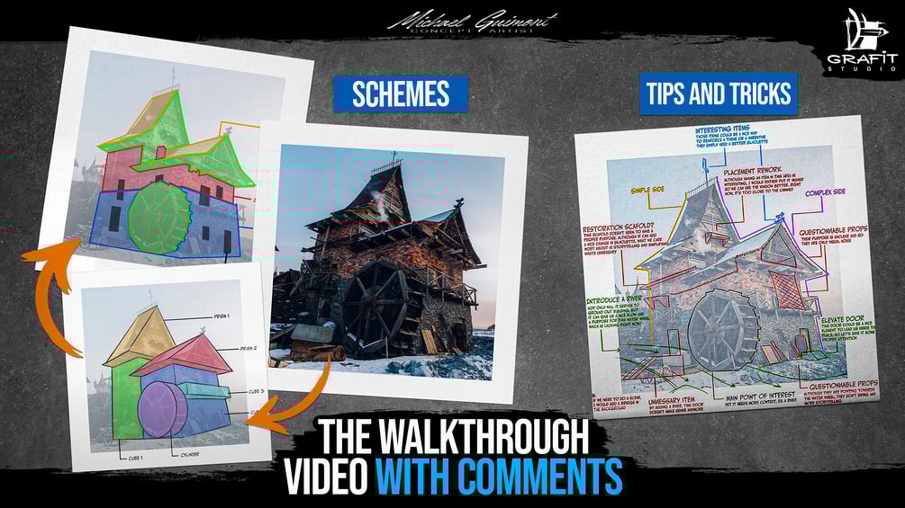Presenting a new amazing tutorial that will inspire you to draw enchanting fantasy houses using our reference pictures. This product is created in collaboration with a concept and visual development artist, Michael Guimont, who worked on PAW Patrol: The Mighty Movie, Clash of Clans, Crash Team Racing Nitro-Fueled, and more! The video tutorial contains a step-by-step drawing process with the English voiceover, comprehensive schemes, sketches, and tips & tricks by the skilled artist! Plus, you can find as a bonus a pack of 220+ architectural reference pictures and a PSD file with a colored version of one of the drawings inside.