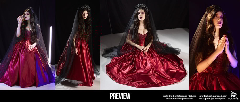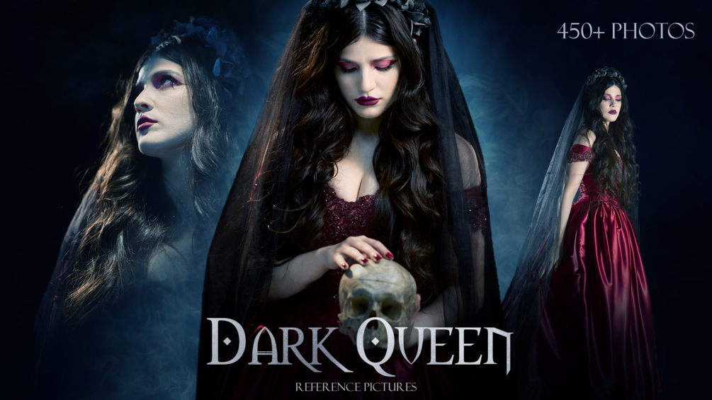 Introducing our 450+ Dark Queen Reference Pictures collection, featuring a captivating model adorned in a gothic outfit. She wears a flowing, deep red dress that contrasts with her bold, heavy makeup. The set includes a variety of emotive poses, often paired with a skull, emphasizing the dark and dramatic tone. Perfect for artists, illustrators, and creatives seeking powerful, gothic-inspired visuals, these high-quality references offer a striking blend of elegance and dark charm.