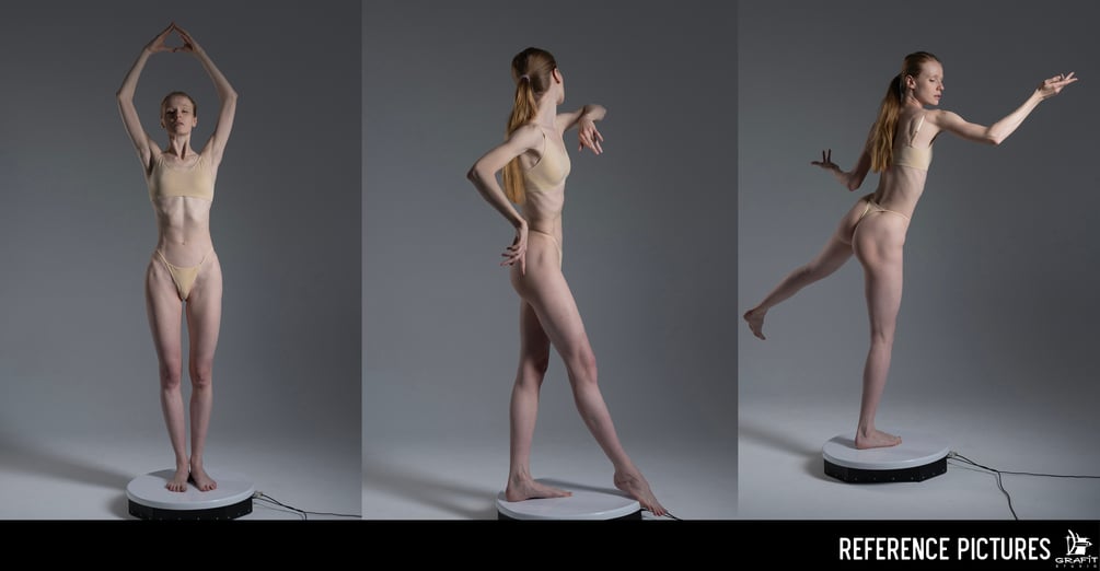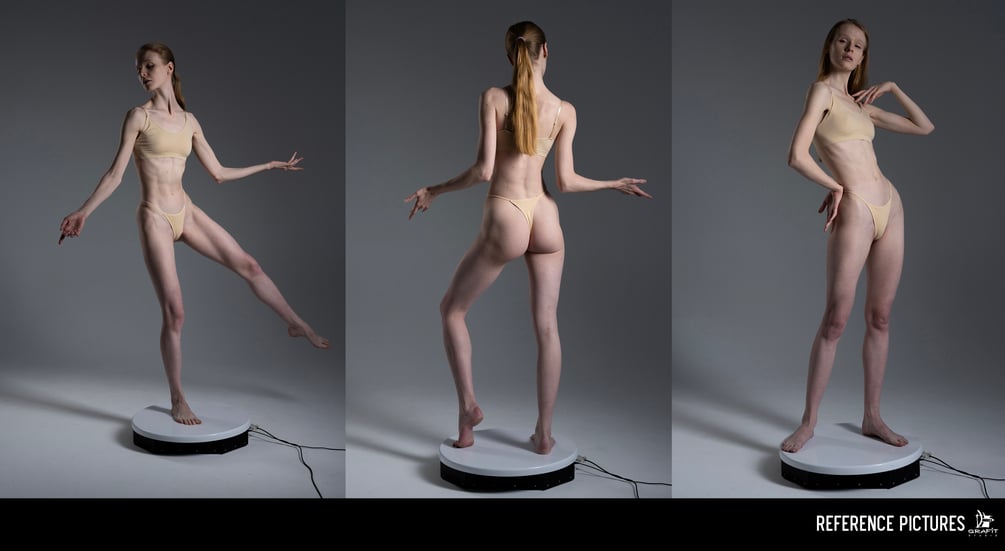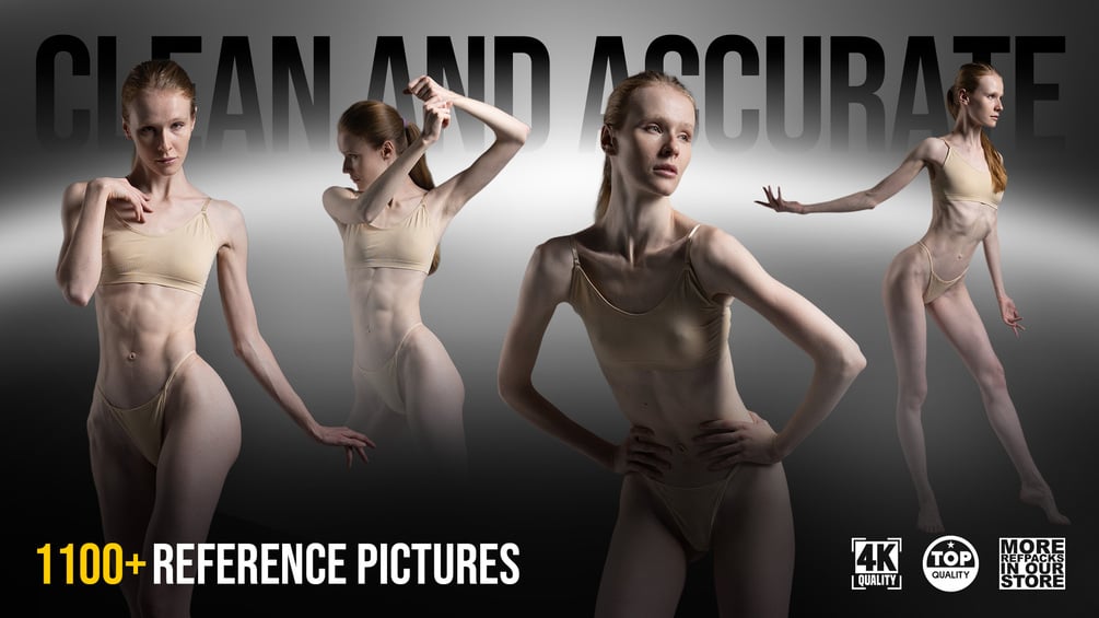 This reference pack contains over 1100 high-quality photos of a blonde female model, created to help artists study anatomy, proportions, and form. All poses are photographed in a clean, minimal environment with neutral lighting, making every detail clearly visible.