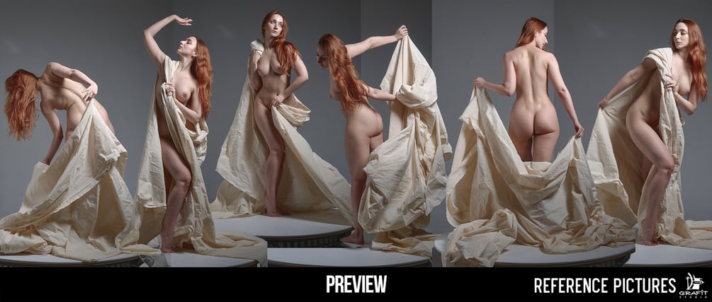 With a strong accent on drapery as an extension of the pose, each shot uses fabric to frame and emphasize the figure, adding depth, movement, and narrative potential to your artwork.